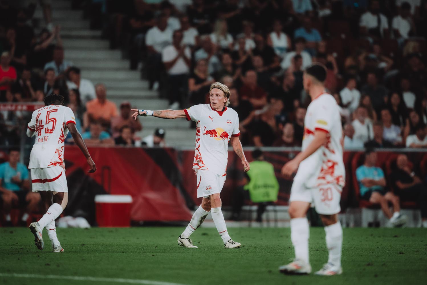 Salzburg beeindruckte mit hohem Tempo, drängte den FC Twente zurück und stellte die Abwehr der Enschede-Elf mehrmals auf die Probe. Kurz vor dem Seitenwechsel bringt Maurits Kajergaard den Gastgeber in Führung.