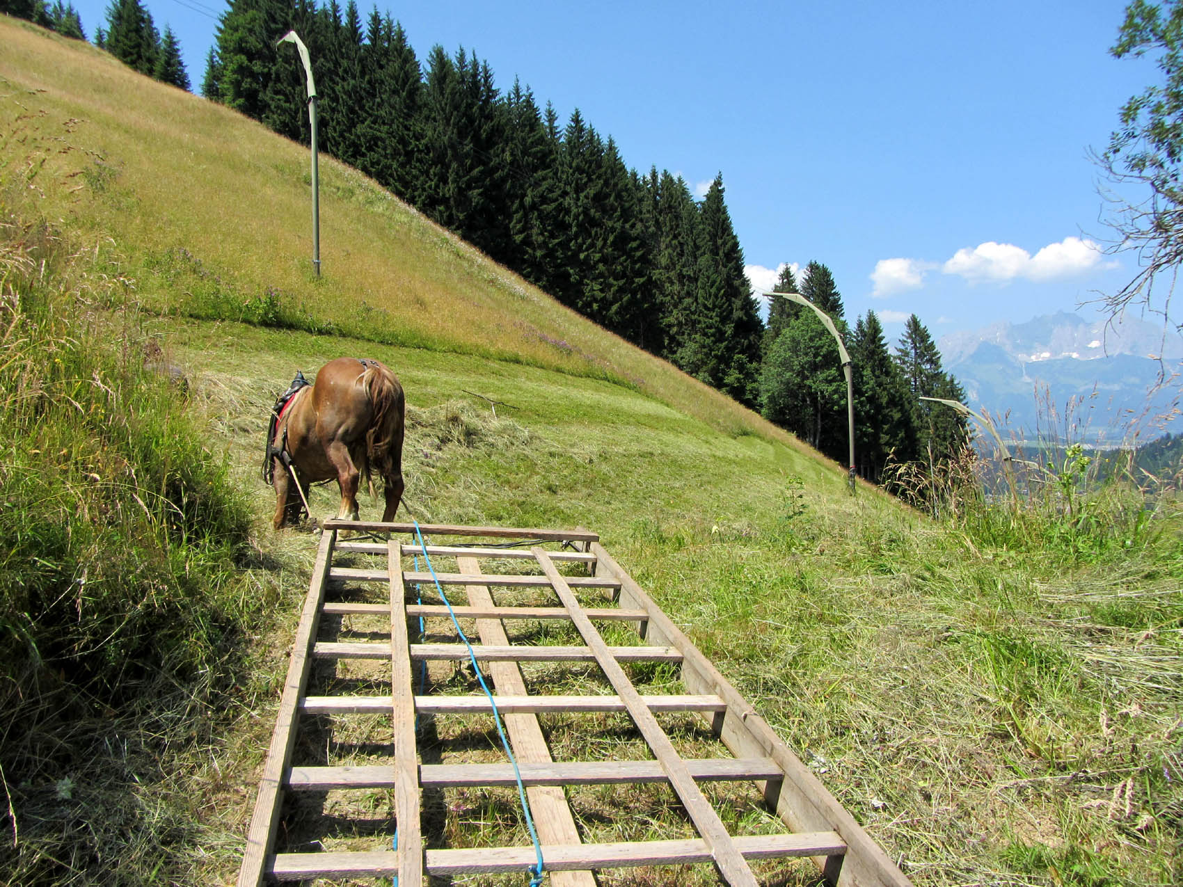 In diesem extremen Steilgelände ist eine maschinelle Bearbeitung kaum möglich. Das Heu wird ganz traditionell mit der „Schloapf“ (Heuschlitten, speziell für steiles Gelände), gezogen von Pferd Betty, eingebracht. Diese natürliche Bewirtschaftung hat viele Vorteile. So wird eine Verdichtung des Bodens hintangehalten und die Bergflora erhalten. Was auf den Fotos recht romantisch aussieht, das ist in Wahrheit eine hart durchzuführende Arbeit.